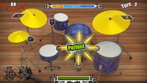Drums Challenge is a new rhythm action game released as a PSP Mini which of course also work on the PS3. The game comprises of a single game screen filled with up to potentially 10 drum and cymbals, each mapped to a controller button. It’s then a case of Simon says as first a pattern is drummed out and then you follow trying to memorize the pattern as well as playing it in time to the beat. A scroll rolls across the top to let you know when the AI ends and you begin. More drum kits and styles are unlocked as you progress through the game. What is most impressive is how the buttons are laid out over the controller to great effect and everything feels very natural to play.