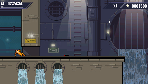 “I Must Run!” is a very simple reflex game for the PSP Mini. Following the story (neatly shown in comic book cutscenes) of a man whose on a prison break out to right a wrongdoing (but another wrongdoing!) you control a man who will not stop running. Your challenge, if you choose to accept it, is to make sure you can jump, double jump, slide and punch your way through increasingly tough levels of obstacles. Miss a jump? Game Over. Hit a wall? Game Over. If you fail to punch objects out your way it slows down your momentum which then means on the bigger jumps you might not make it across. The crux? It’s very hard! I’ve never seen the end so I’m assuming there is one and it isn’t just a high score fest. Every few in-game hours (about 90 seconds) the scenery changes. The graphics themselves are crisp and neat with lovely parallax backgrounds and plenty of on screen action which adds to the games difficulty itself as your eyes focus in so intently on what’s going on around you, its sometimes easy to get distracted.